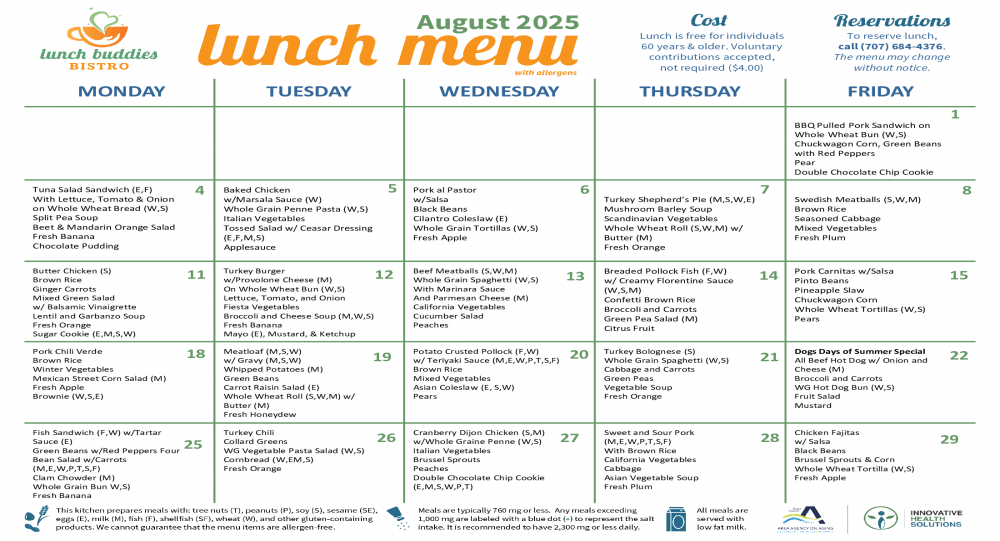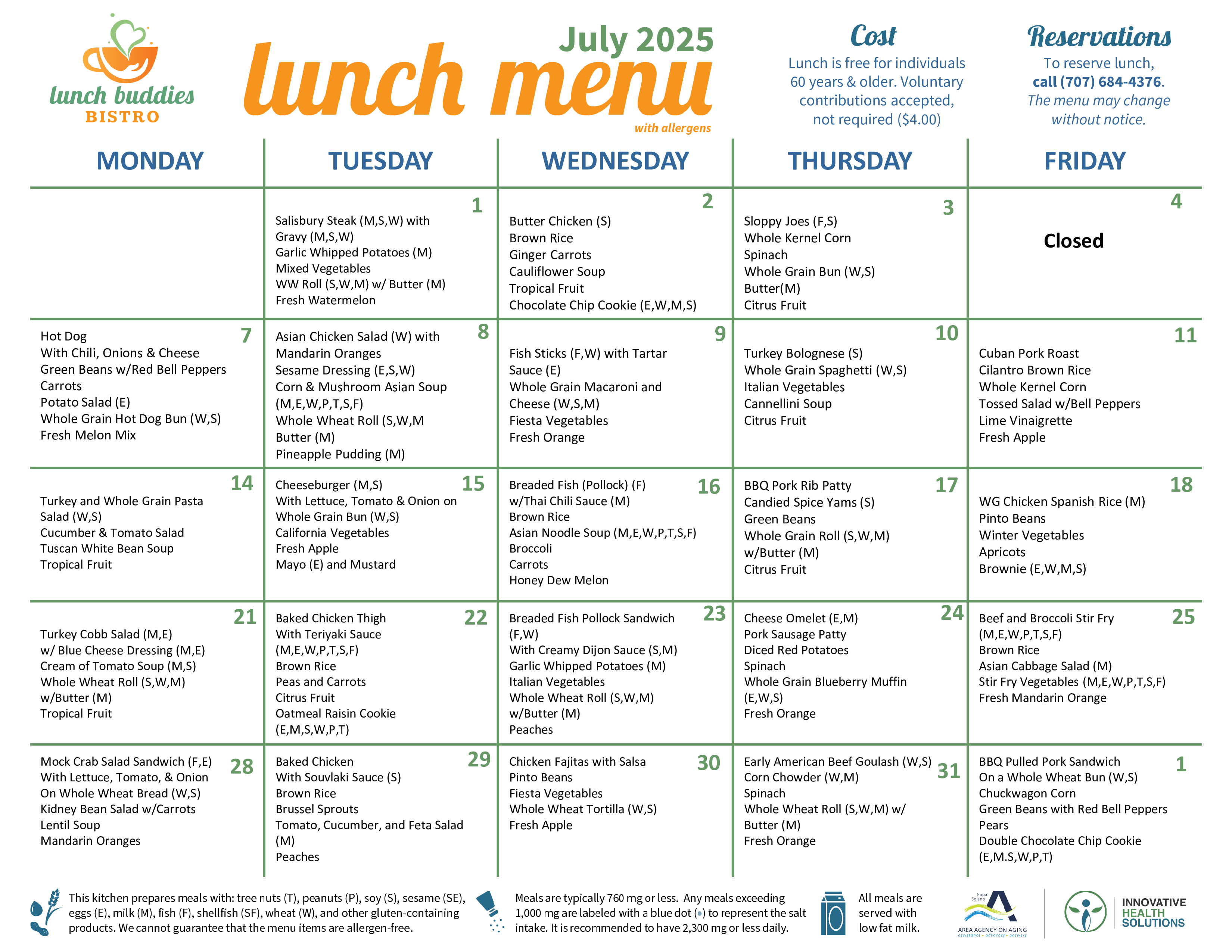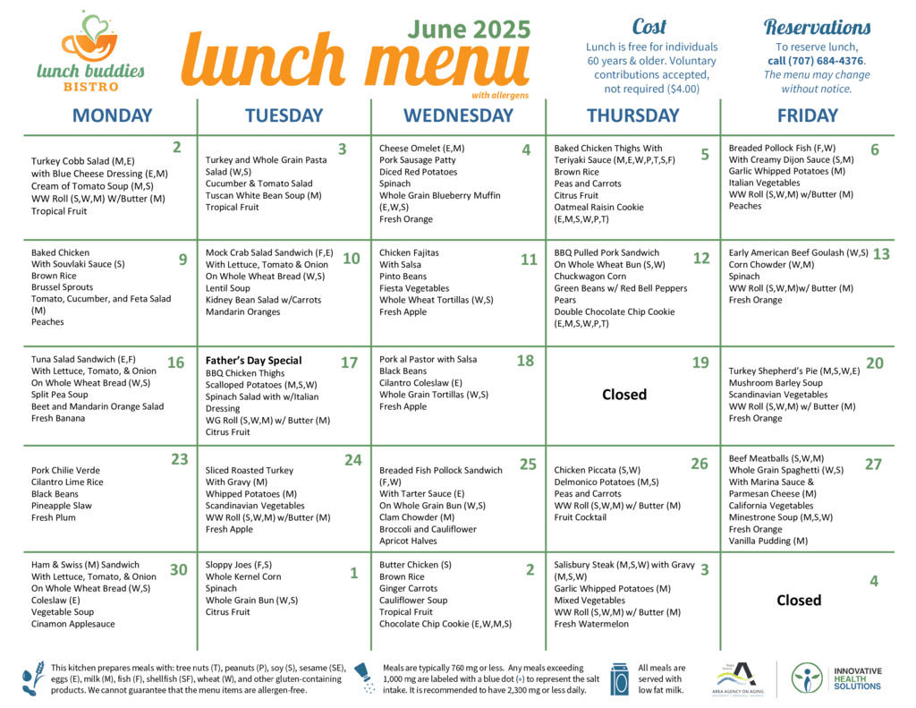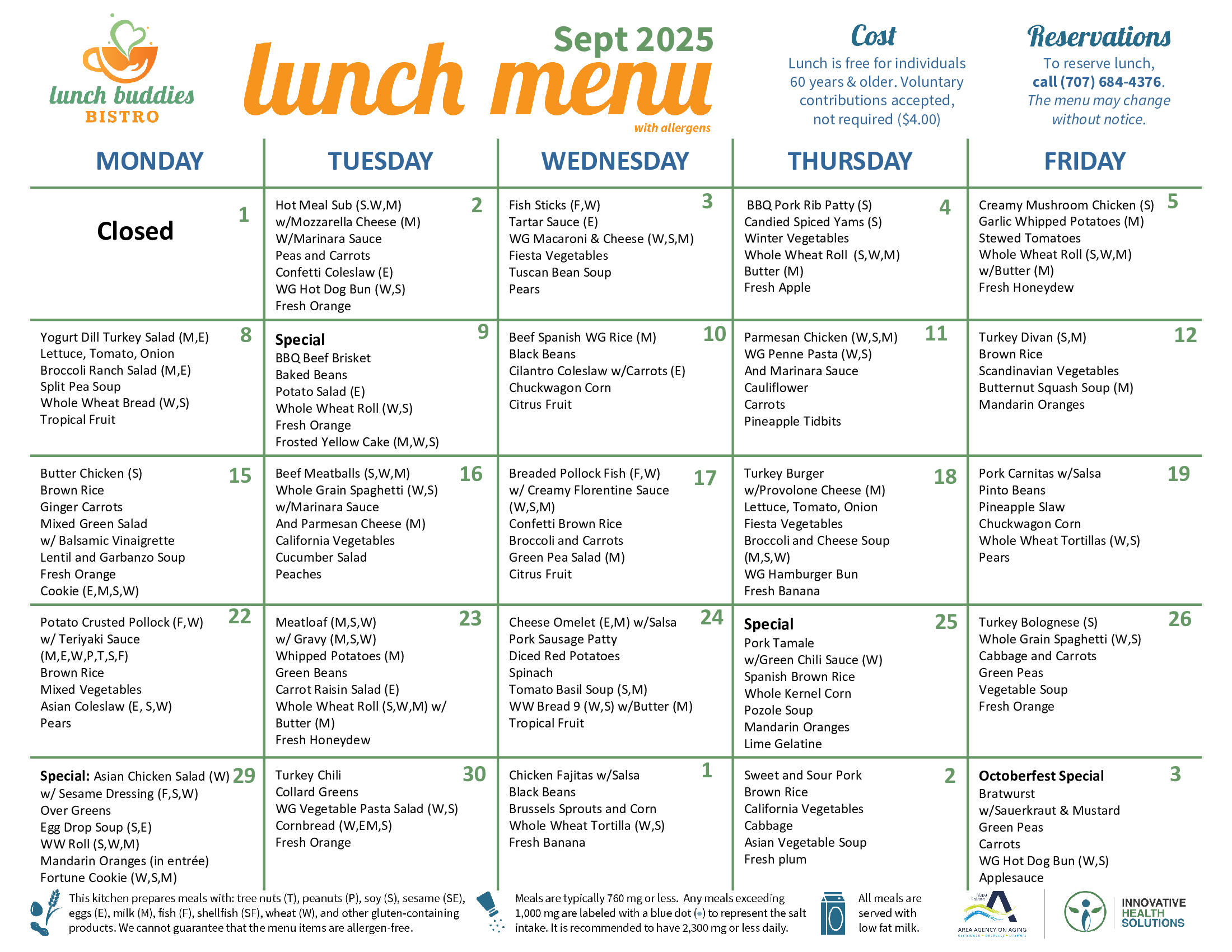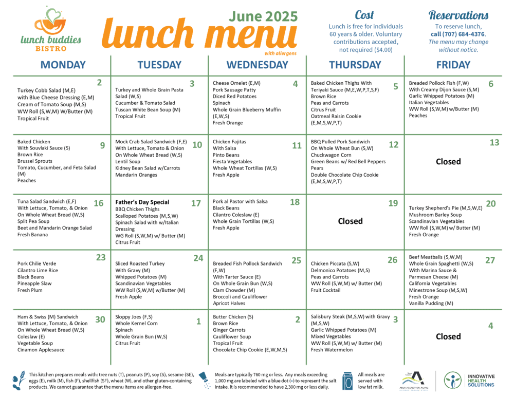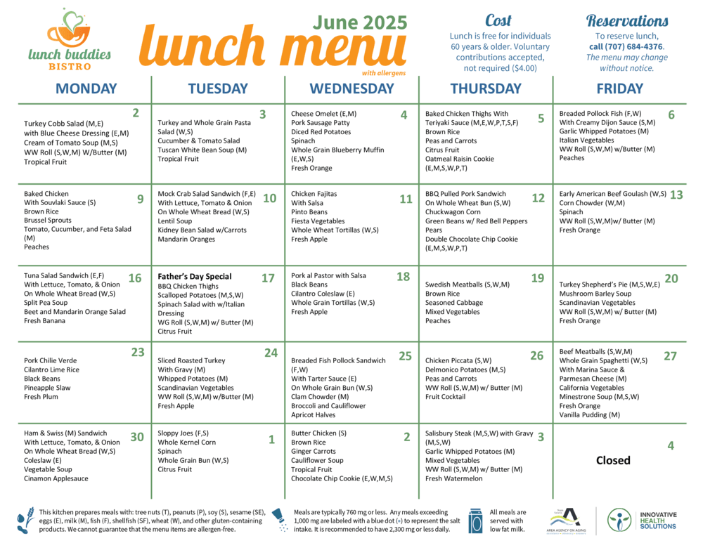 The Lunch Buddies Bistro program serves nutritious, heart healthy, diabetic friendly lunches to older adults in a group setting with an opportunity to socialize with others and get involved in fun activities. Voluntary contributions are welcome, but not required.
